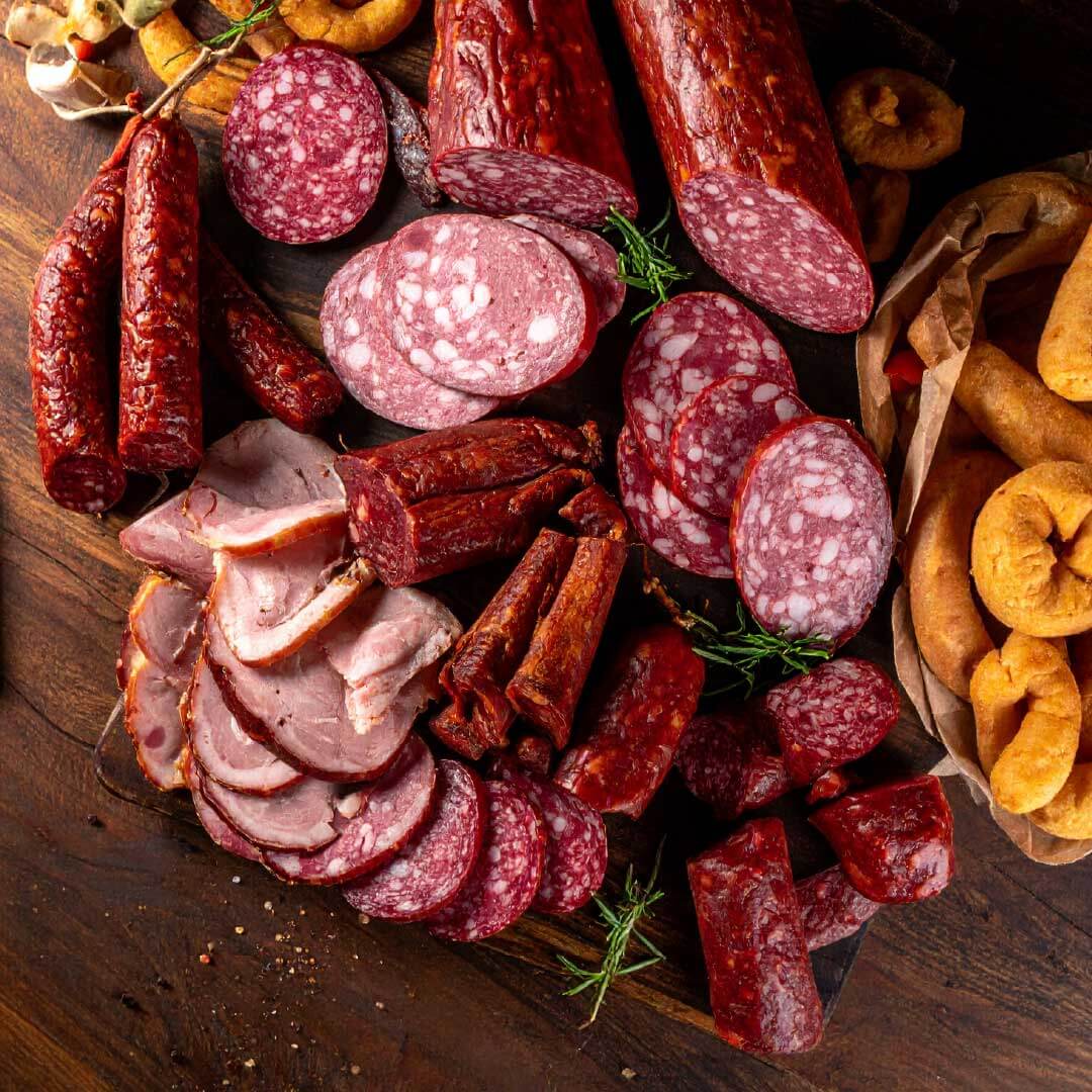 Embutidos e defumados: salame misto, salame suíno, linguiça defumada, costela defumada, lombo defumado, torresmo e banha de porco.