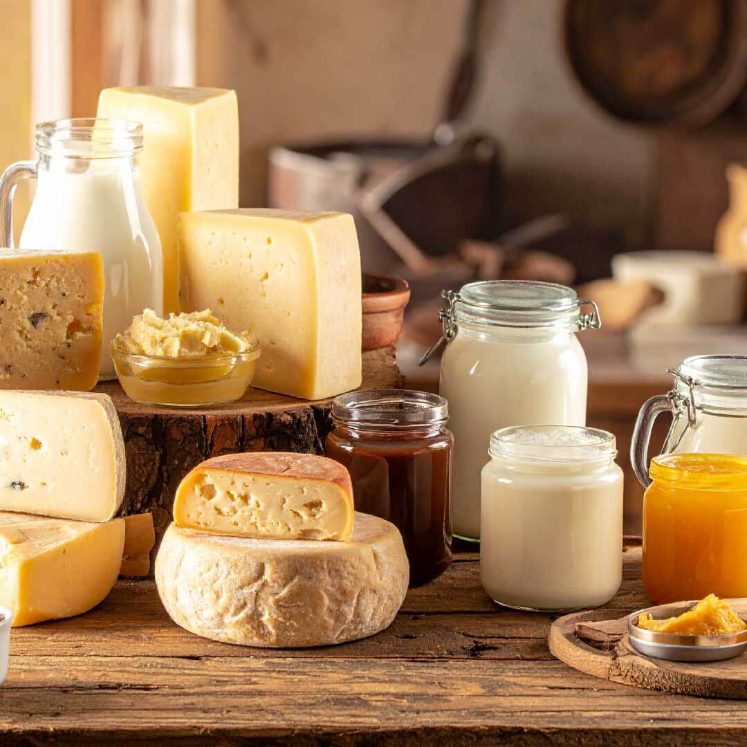Laticínios e derivados do leite: queijo colonial, queijos autorais, manteiga, nata, doce de leite, ghee e sorvetes artesanais de diversos sabores.